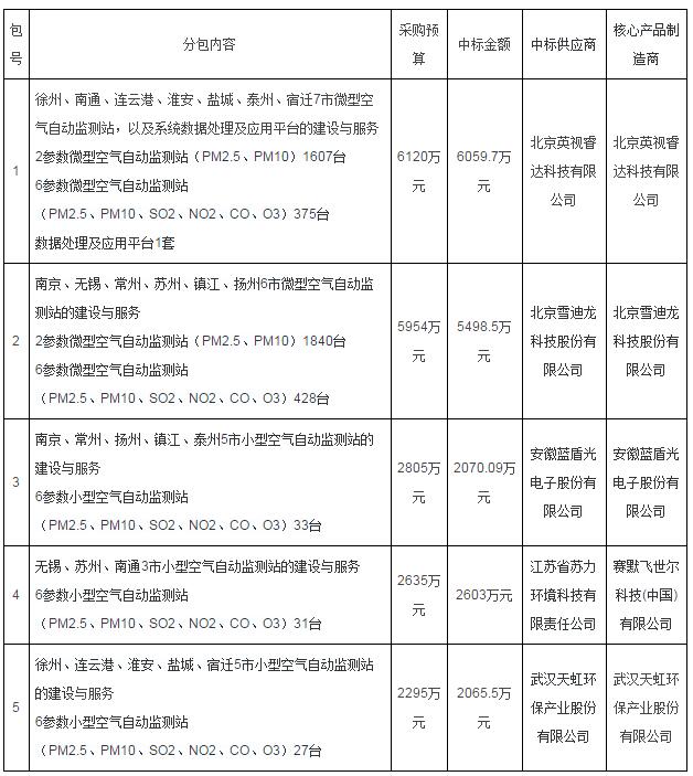 “江蘇省大氣PM2.5網格化監測系統采購項目”近日發布中標公告,五家廠商中標,總金額達18296.79萬元,供應商為北京英視睿達科技有限公司、北京雪迪龍科技股份有限公司、安徽藍盾光電子股份有限公司、江蘇省蘇力環境科技有限責任公司、武漢天虹環保產業股份有限公司。