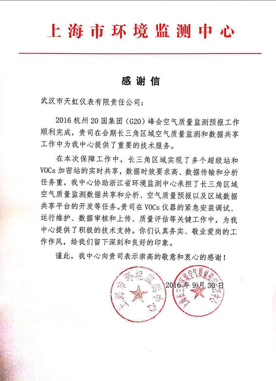 武漢天虹環保產業股份有限公司受國家環保部委托,派出TH-300B VOCs在線監測系統參加G20峰會長三角區域環境空氣VOCs自動監測,負責上海淀山湖空氣自動站,江蘇宜興市監測站空氣自動站,安徽蕪湖市監測站空氣自動站三個站點的VOCs在線監測工作,圓滿完成了各項任務。國慶節前,我公司收到了負責這次保障工作的上海市環境監測中心和上海長三角區域空氣質量預測預報中心聯名發來的感謝信,充分肯定了我公司的工作人員,在G20峰會長三角區域環境空氣VOCs自動監測期間儀器安裝調試、運行維護、數據審核和上傳、質量評估等關鍵工作中的認真務實、敬業愛崗的工作作風,為中心提供了積極的技術支持。TH-300BVOCs在線監測系統發揮了重要作用,在線監測的VOCs項目最多。